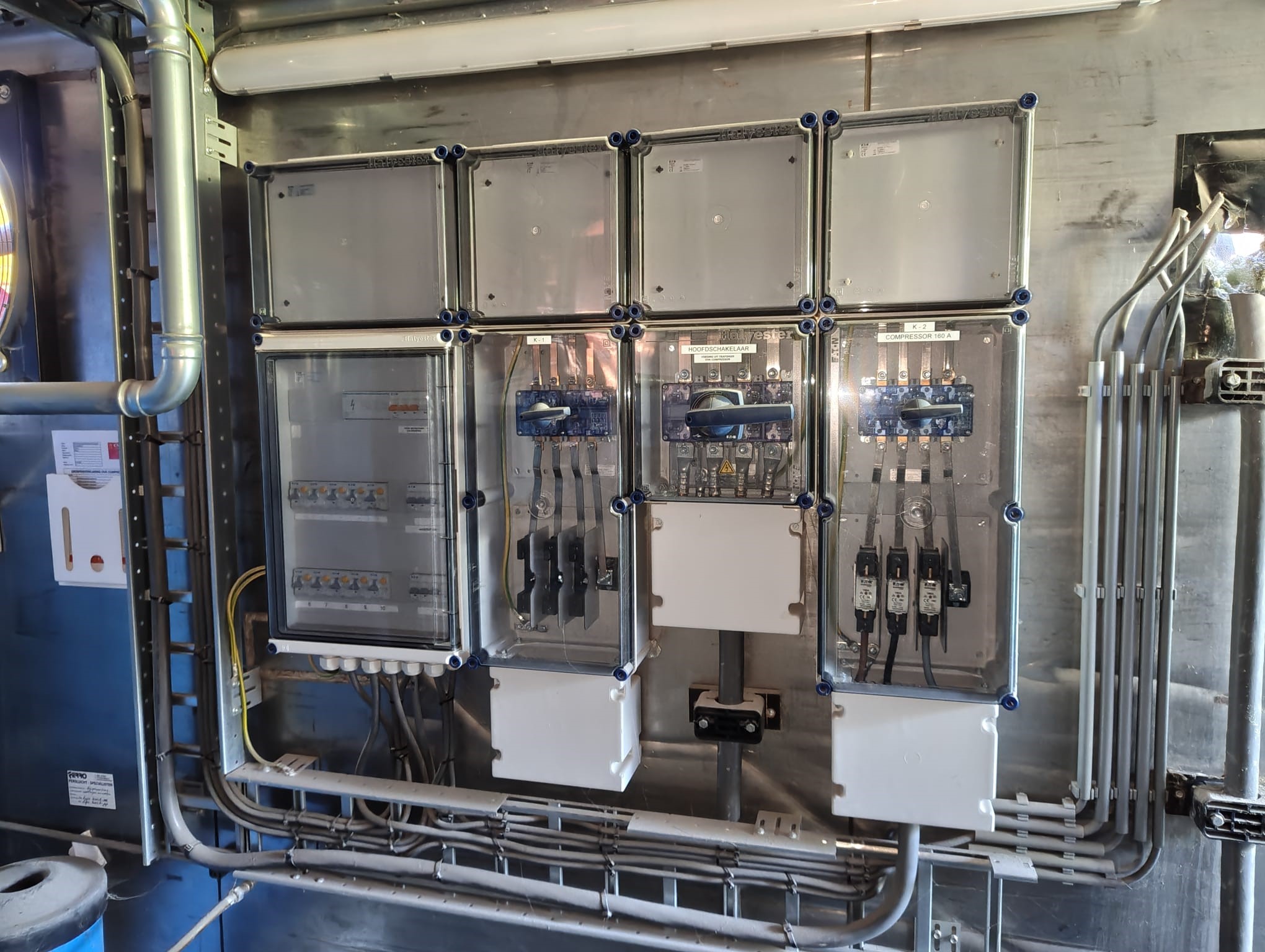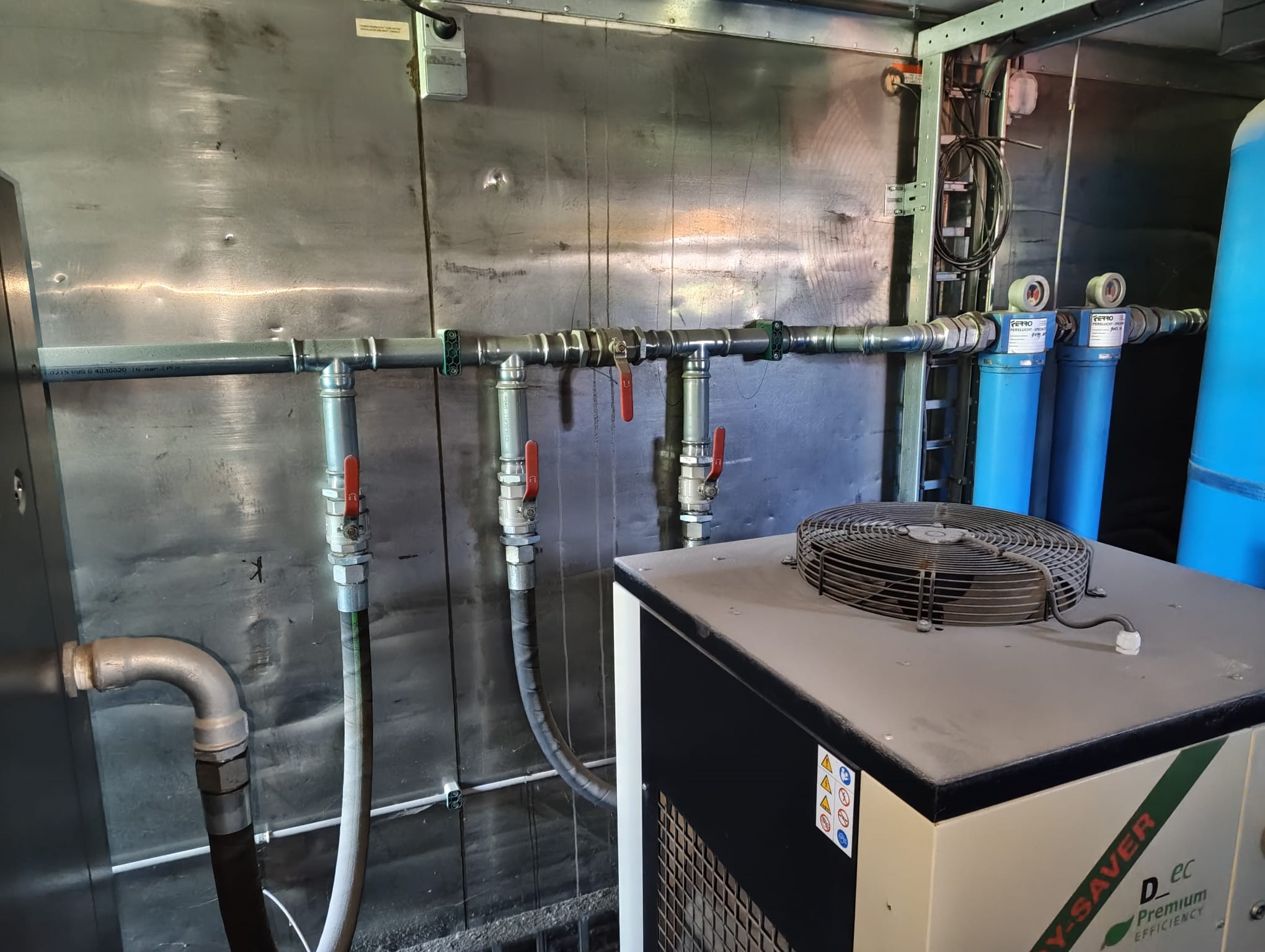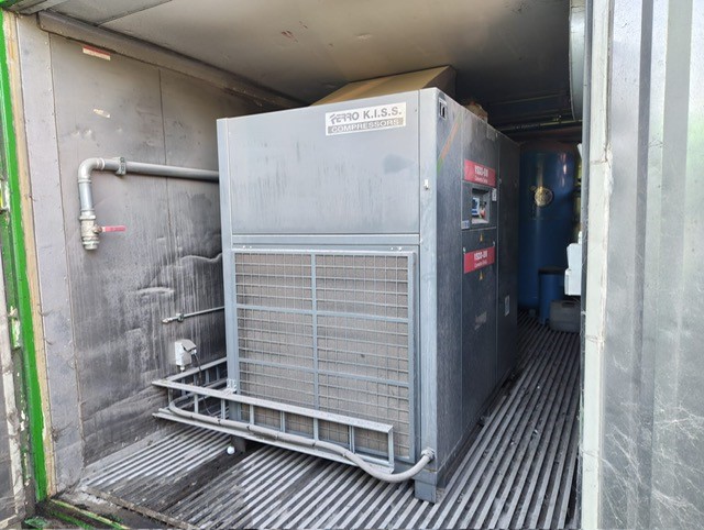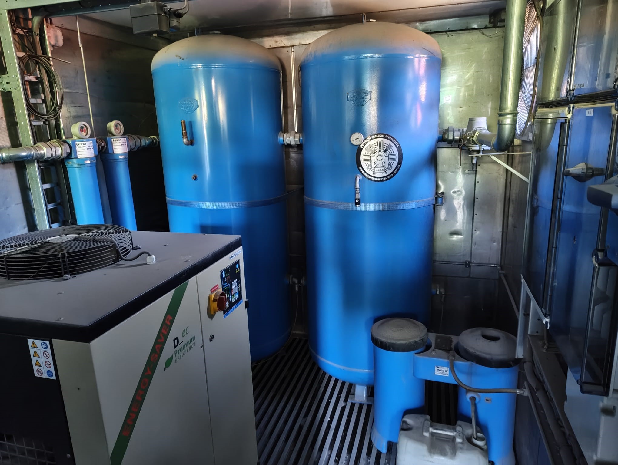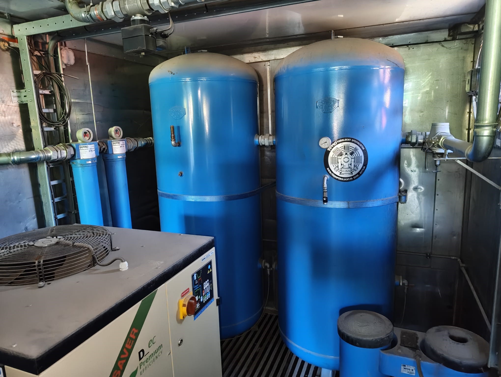 Volledig samengebouwde persluchtunit in 20ft-container, bestaande uit een compressorinstallatie met droger, 2 x 1.000 liter persluchtbuffer, waterafscheiders en complete elektrische voedings- en verdeelvoorzieningen inclusief zekeringen. De unit is ontworpen als een compacte totaaloplossing voor betrouwbare persluchtvoorziening.
